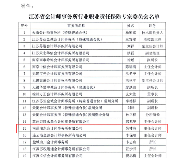 我所吳林海入選江蘇省會計師事務(wù)所行業(yè)職業(yè)責(zé)任保險專家委員會